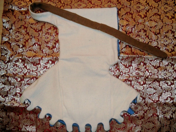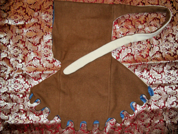 Gugel aus dichter, wetterabweisender Wolle in Mi-Parti Weiss und Braun (walnussgefärbt), mit blauer Seide gefüttert (mit Indigo gefärbt), und Zaddeln am Kragen. Lange Sendelbinde. Komplett mit der Hand vernäht, in Wolle weiß und braun (ebenfalls Walnußgefärbt), sowie blauer Seide.